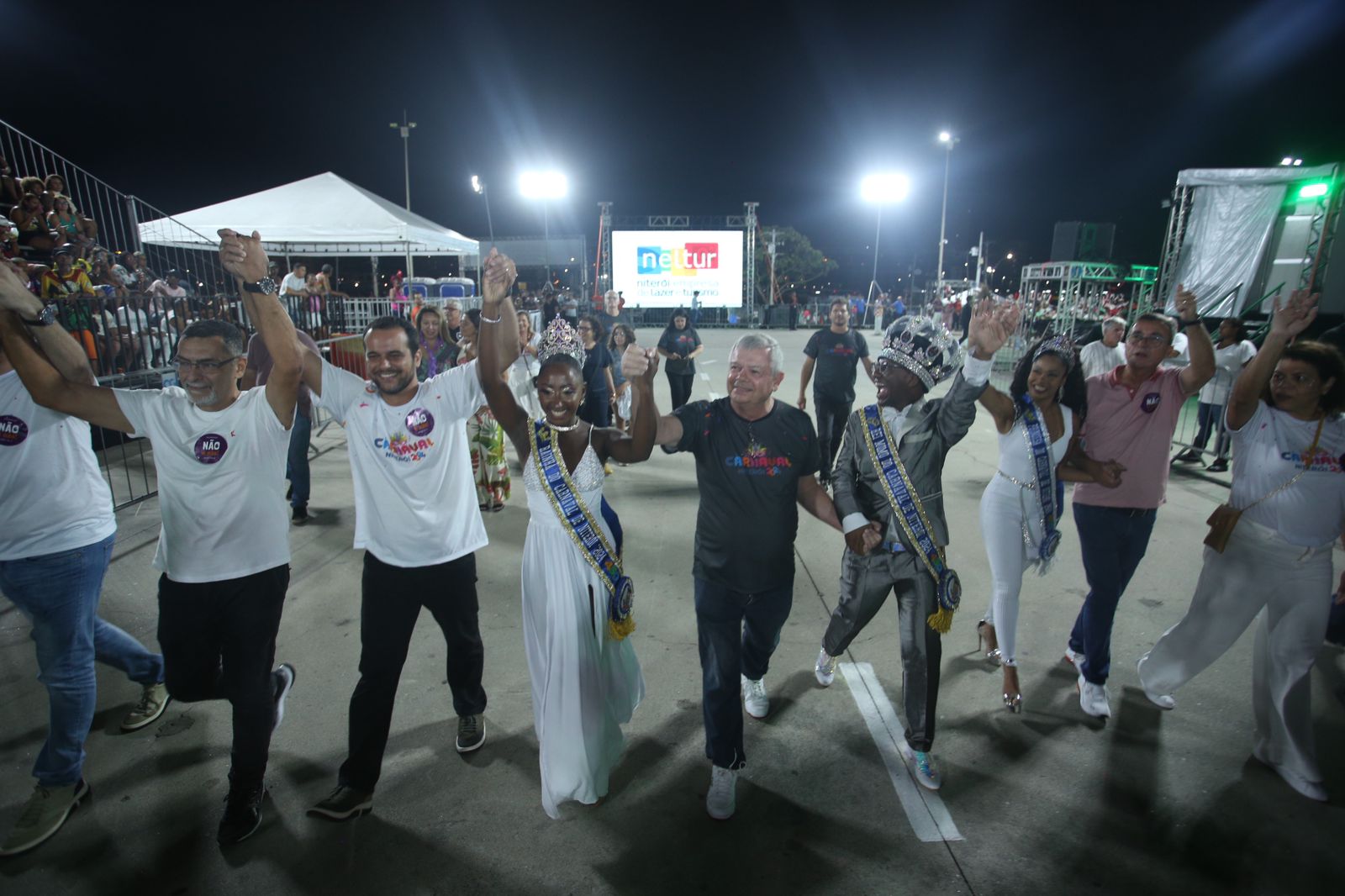 Depois, a Corte Momesca do Carnaval Niterói 2024, formada pelo Rei Momo, Sorrisouh, a Rainha, Taís Luiza e a Princesa, Fabiely Martins, mostrando muita simpatia e samba no pé, acompanhados do prefeito da cidade, Axel Grael, do vice-prefeito, Paulo Bagueira, do presidente da Neltur, André Bento, da secretária de Governo e presidente da Comissão de Carnaval, Rúbia Secundino, entre outros secretários e autoridades, saudaram todos os espectadores que lotaram as arquibancadas.